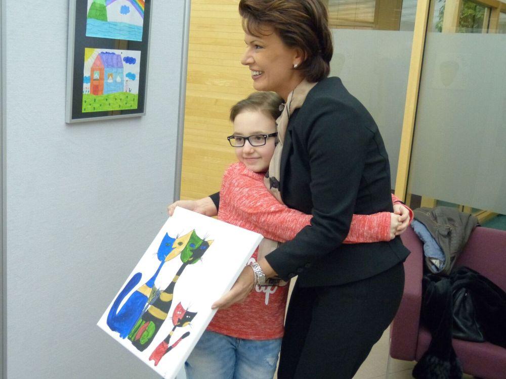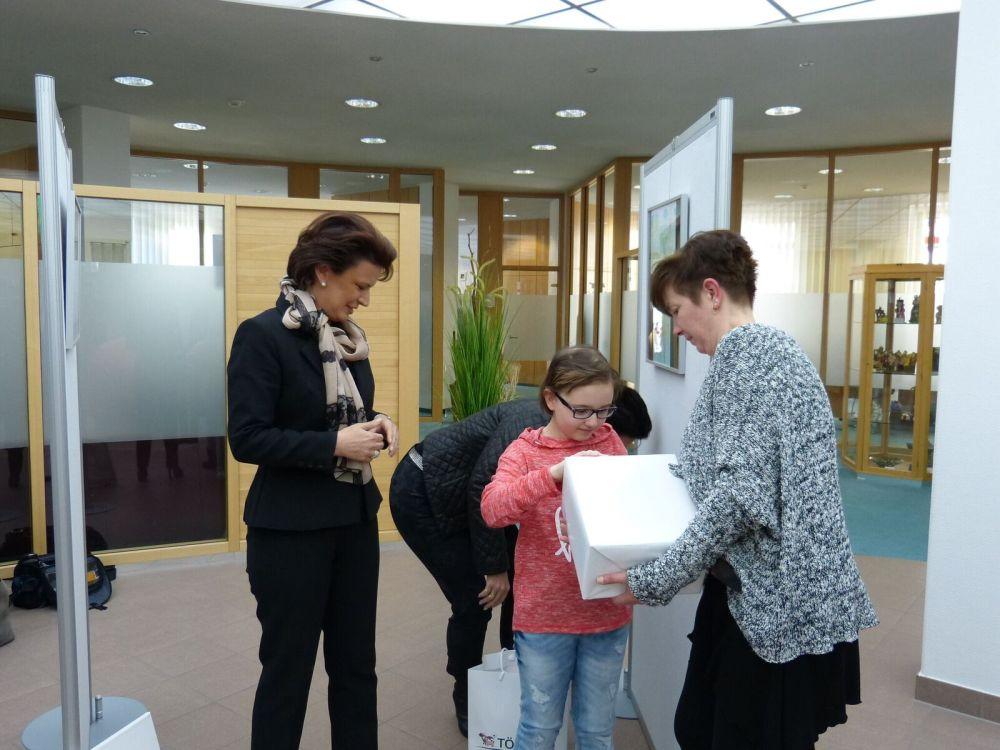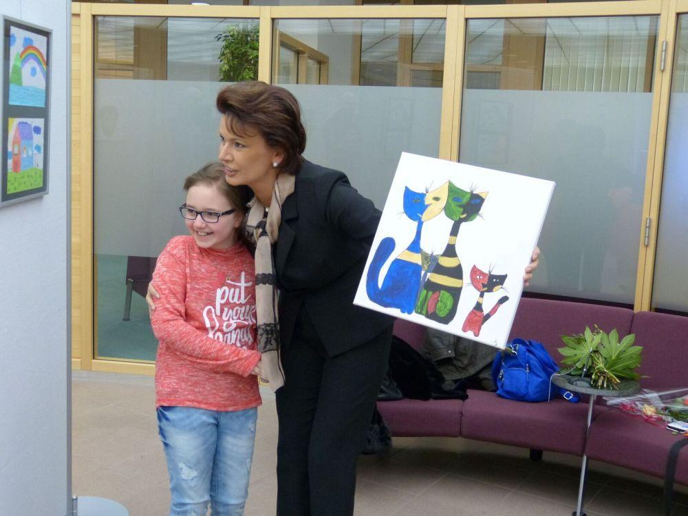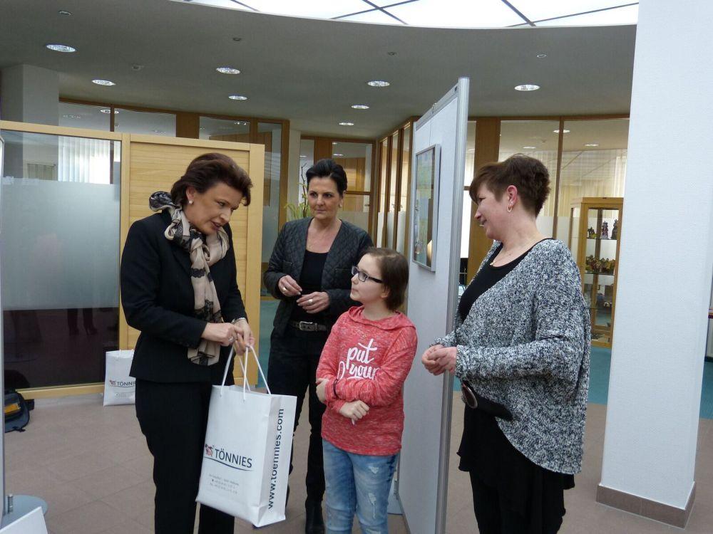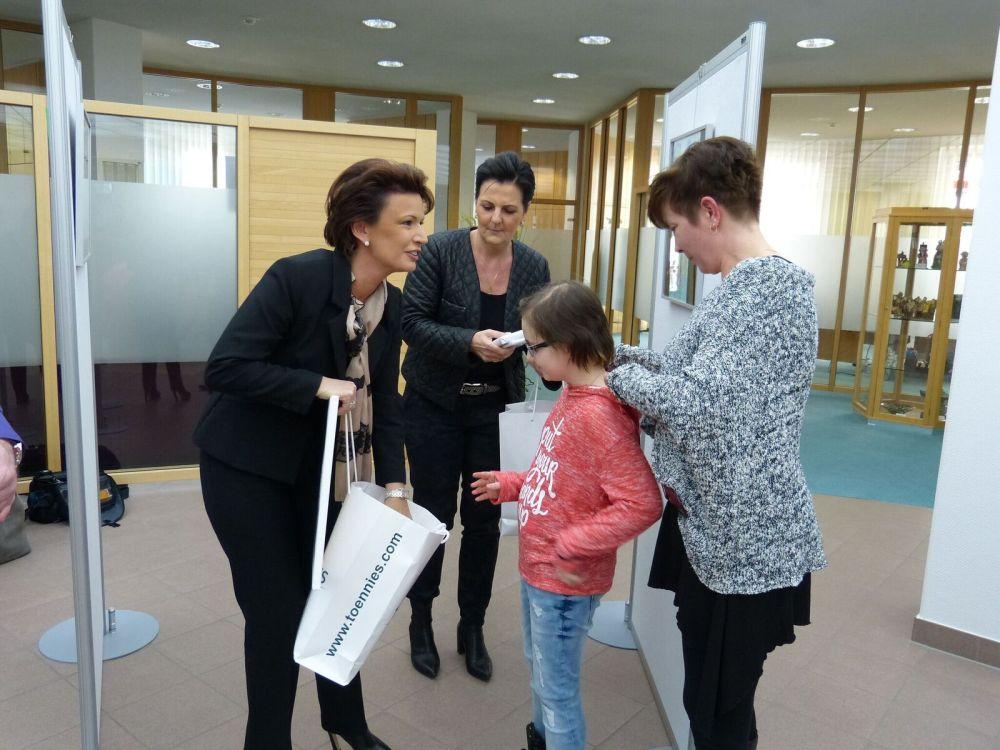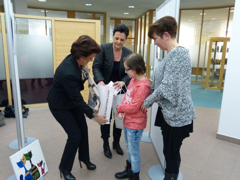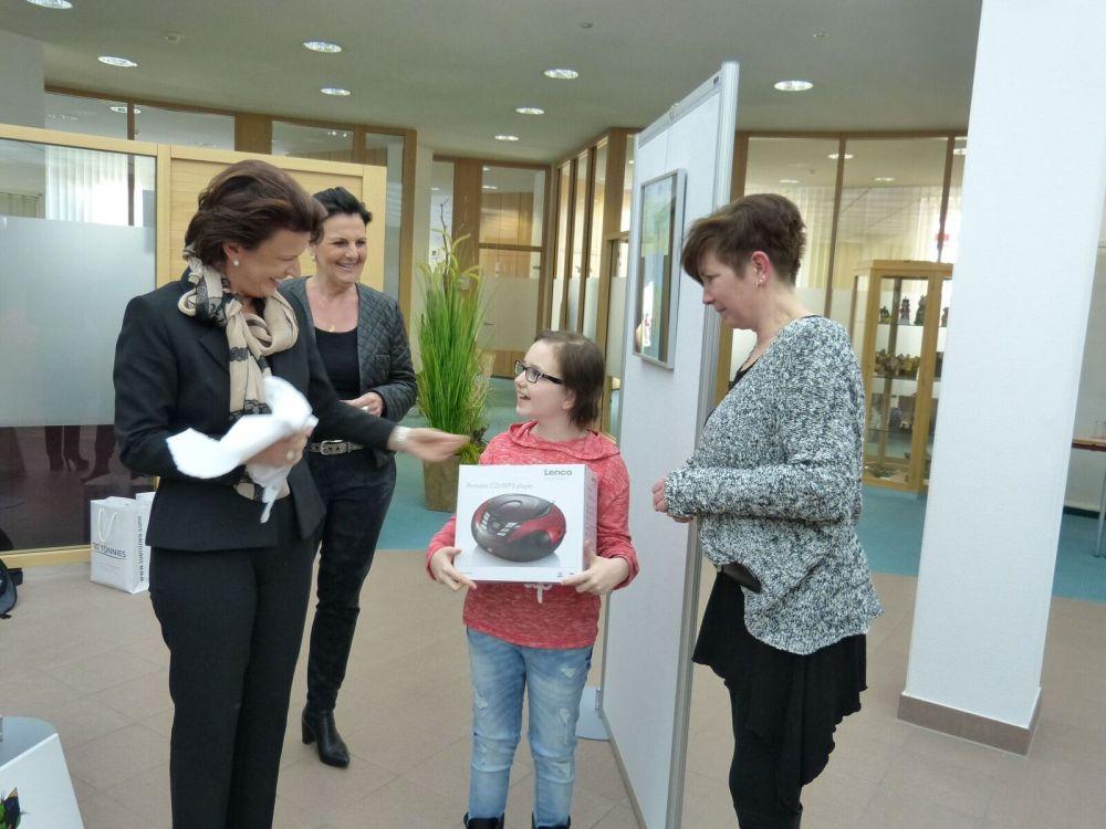 Margit Tönnies, Schirmherrin der Aktion Kinderträume besuchte die Ausstellung und war begeistert. Als kleines Geschenk brachte sie ihr einen Radio CD Player mit, worüber sich Antonia sehr gefreut hat.