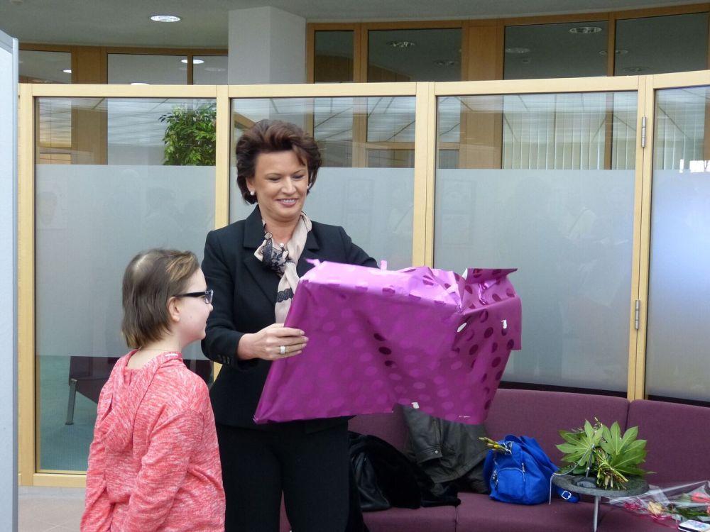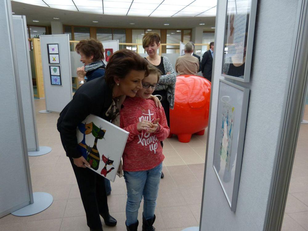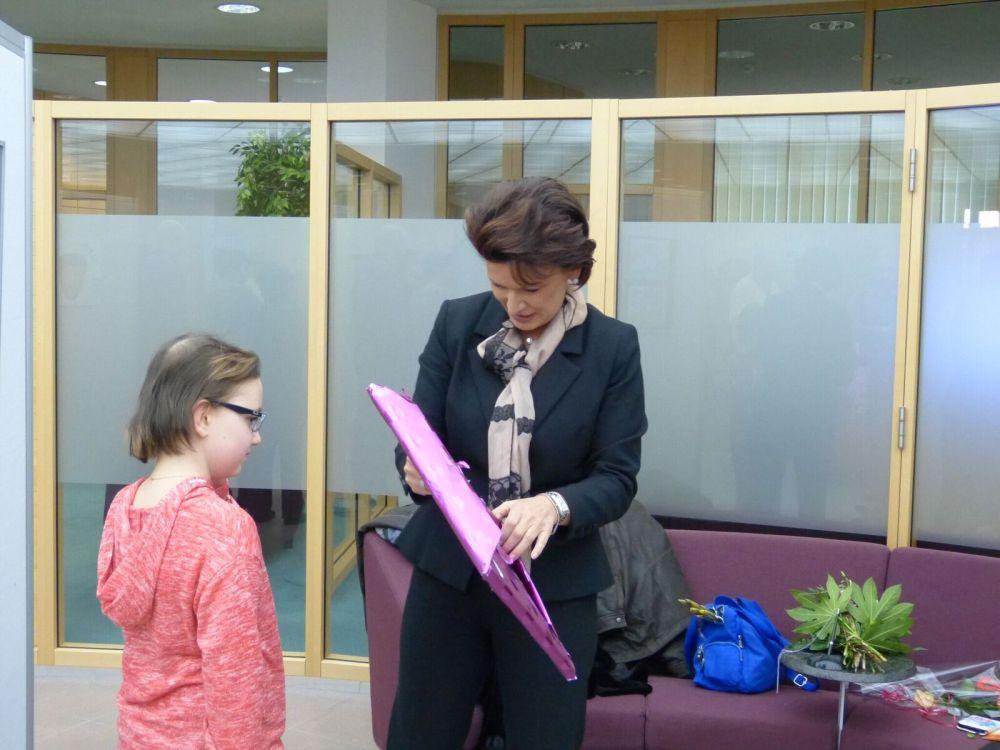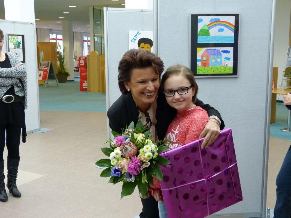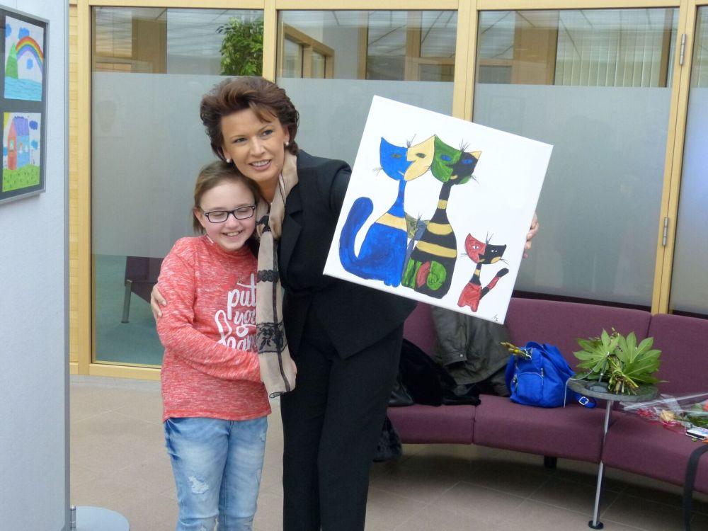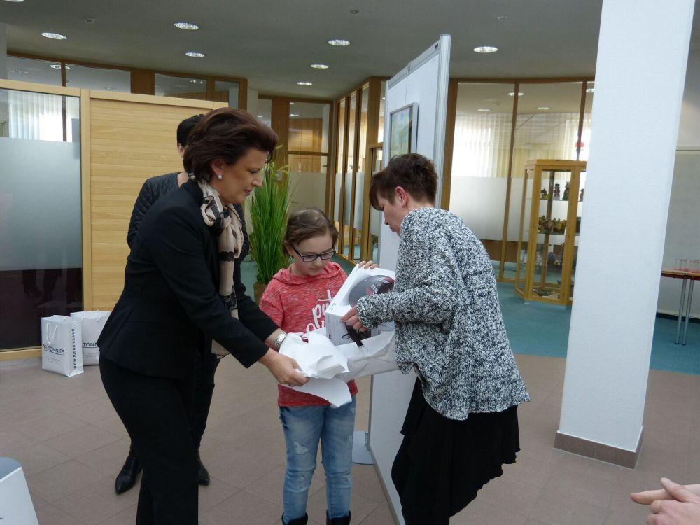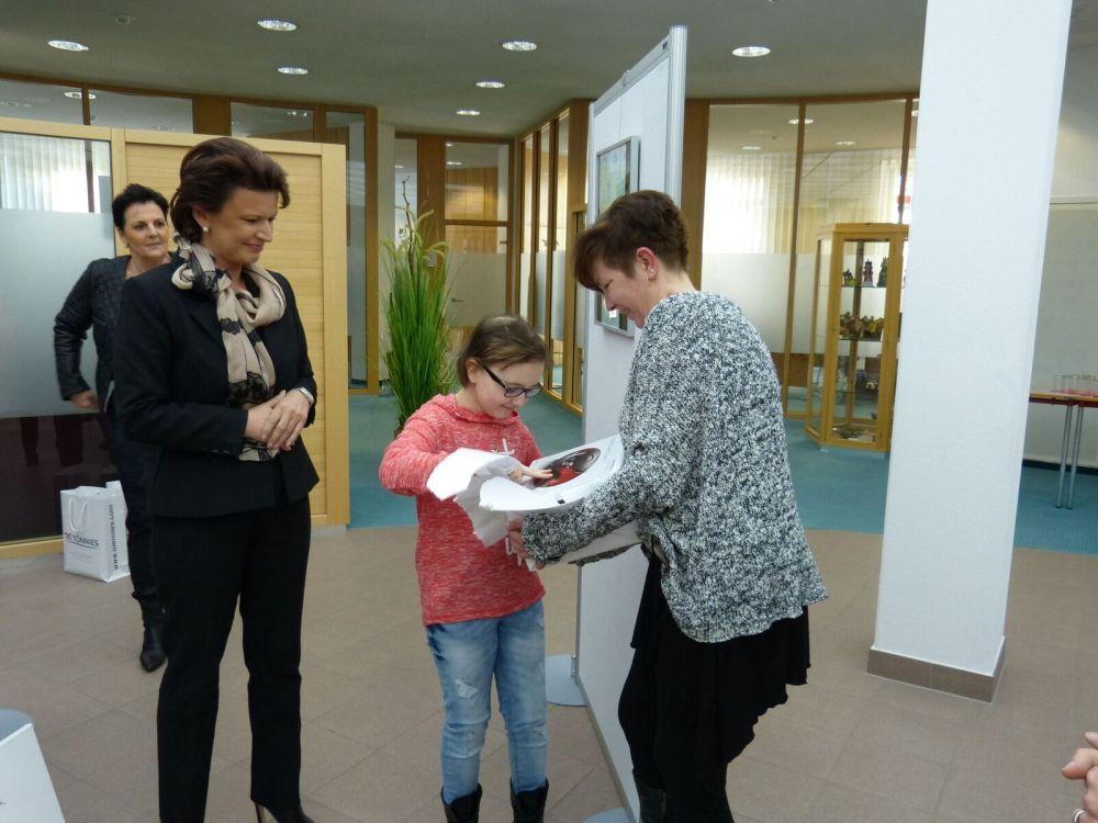 Margit Tönnies, Schirmherrin der Aktion Kinderträume besuchte die Ausstellung und war begeistert. Als kleines Geschenk brachte sie ihr einen Radio CD Player mit, worüber sich Antonia sehr gefreut hat.