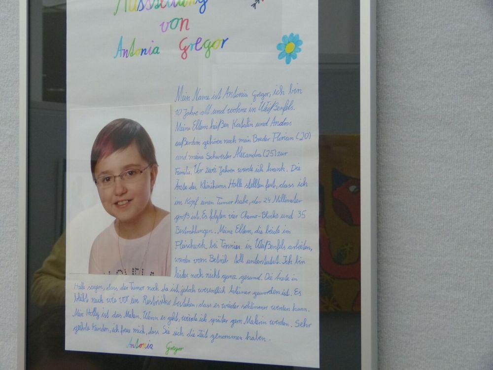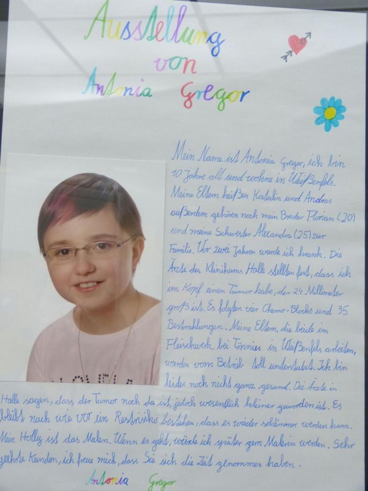 Antonia malt mit Begeisterung und das möchte sie später auch beruflich machen. Ihr großer Traum war, einmal in einer Kunstausstellung ihre Bilder zeigen zu können. Dieser Wunsch wurde von Herrn Klaus Dieter Kurnick von der Mitteldeutschen Zeitung, der für Antonia eine Ausstellung in der Kreissparkasse Weißenfels organisierte, erfüllt.