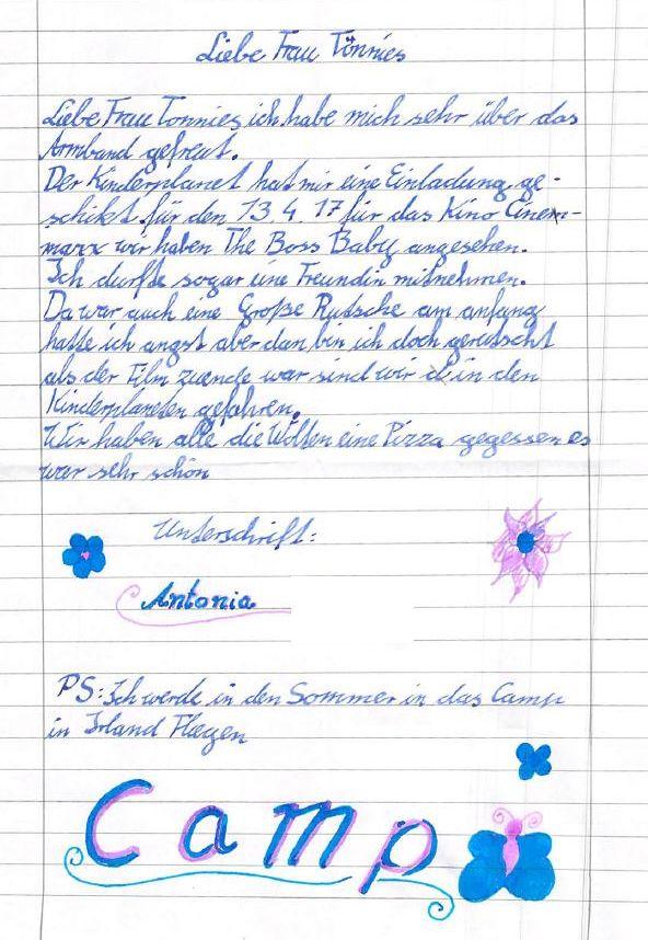 Antonia, 10, kam gesund zur Welt und verbrachte die ersten Lebensjahre ohne besondere Beeinträchtigungen. 2014 dann der Schock, es wurde ein über 24 mm großen Hirntumor an der Hypophyse (Hirnanhangdrüse) entdeckt. Sie erhielt vier Chemo-Blocks und 35 Bestrahlungen. Der Tumor schrumpfte zwar, ist aber noch da. Es bleibt nach wie vor ein Restrisiko, dass es wieder schlimmer werden kann. Aktion Kinderträume hat der Familie im letzten Jahr einen Dreitagesausflug ins Phantasialand ermöglicht.
