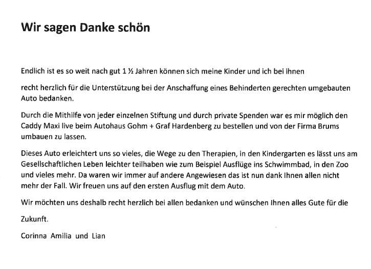 Die beiden Geschwister leben bei ihrer alleinerziehenden Mutter, die aufgrund der Pflege der beiden keiner Beschäftigung nachgehen kann. Die Familie besitzt derzeit kein Auto und ist gezwungen, alle Wege zu Fuß bzw. mit dem Reha-Buggy zu erledigen. Von Zeit zu Zeit bekommt die Mutter ein Auto von ihrem Bruder, Freunden oder Nachbarn geliehen. Dies ist auf Dauer keine Lösung, um die regelmäßigen Termine in Kliniken sowie bei Ärzten und Therapeuten wahrnehmen zu können. Zudem bekommt Amilia aufgrund ihrer OP in naher Zukunft einen Rollstuhl und bei Lian ist es ungewissen, wann er auf einen Rollstuhl angewiesen sein wird. Daher hat die Familie Kontakt aufgenommen und um finanzielle Unterstützung beim Kauf eines behindertengerechten PKWs gebeten, in dem auch Rollstuhl und Reha-Buggy Platz finden.