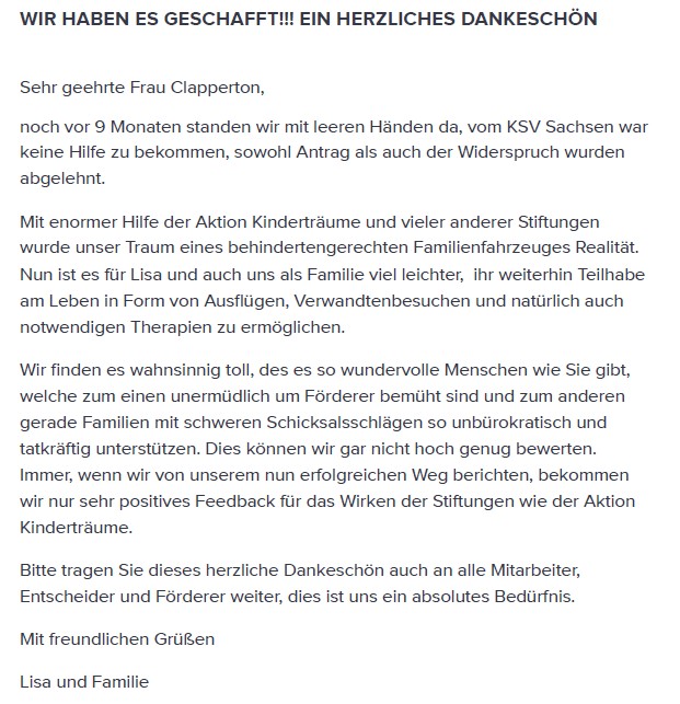 Mittlerweile ist Lisa zu groß für ihren Reha-Buggy und für alle Beteiligten wird das Tragen und Setzen in das Auto immer schwieriger. Die Familie hat Kontakt aufgenommen und um Unterstützung für ein dringend benötigtes behindertengerechtes Fahrzeug gebeten. So könnten sie Lisas Teilhabe am sozialen Leben sowie Ausflüge, Besuche bei Verwandten und Freunden weiterhin ermöglichen, aber natürlich auch, um Lisa zu allen notwendigen Therapien und Ärzten bringen zu können.