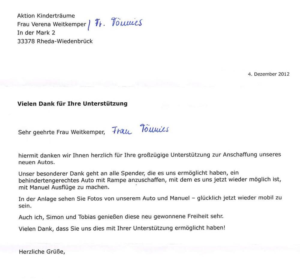 Nach der Trennung vom Vater zog die Mutter in eine eigene Wohnung. Die Ausstattung der Wohnung zerrten ihre finanziellen Mittel auf und ein dringend benötigtes behindertengerecht ausgestattetes Fahrzeug kann sie nicht allein finanzieren. Das bisherige Familienauto ist alt und reparaturbedürftig und weil der Rollstuhl und andere Hilfsmittel für Manuel nicht mehr ins Auto passen, sind gemeinsame Unternehmungen mit den Brüdern nicht mehr möglich. Aus diesem Grund hat die Mutter um Unterstützung gebeten.