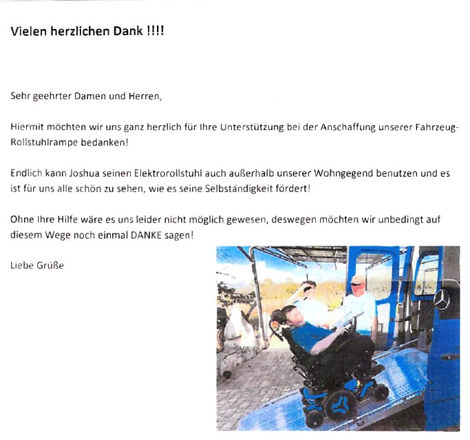 Joshua macht sehr gerne Ausflüge mit seiner Familie, am liebsten irgendwo hin, wo man Tiere beobachten kann. Deshalb haben sie sich auch einen großen Sprinter angeschafft, weil hier alle Familienmitglieder mitsamt den beiden Hunden und den benötigten Hilfsmitteln Platz finden. Da der Familie derzeit die nötigen finanziellen Mittel für den Einbau einer Rampe für Kais Rollstuhl fehlen, haben sie Kontakt aufgenommen und um Unterstützung gebeten.