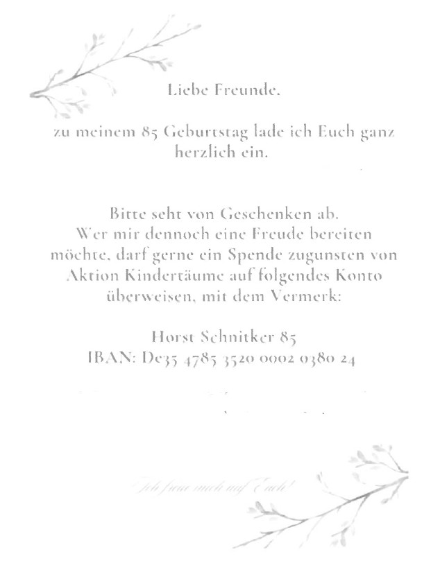 Horst Schnitker hat anlässlich seines 85. Geburtstags seine Gäste zum Spenden aufgerufen und auf Geschenke verzichtet. Dabei kamen zugunsten Aktion Kinderträume insgesamt 2.780 EUR zusammen.
