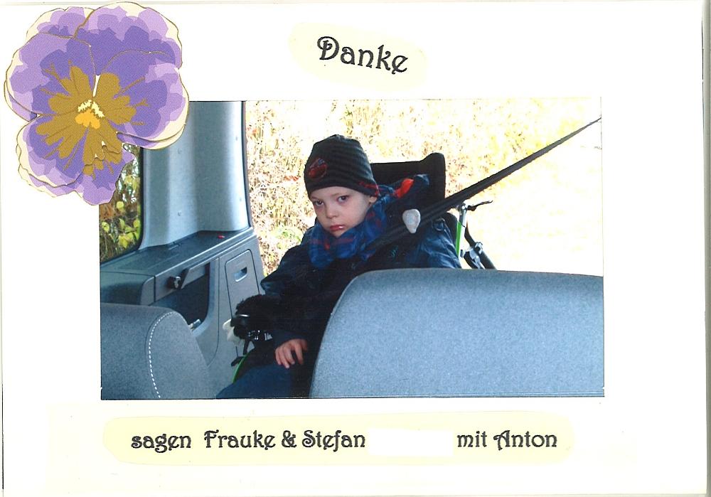 Anton lebt zusammen mit seinen Eltern. Seit September 2012 wird er von einer Pflegeschwester betreut. Mit ihr besucht er regelmäßig die schulvorbereitende Einrichtung in einer Körperbehinderten-Schule. Er hat sichtlich Spaß mit seiner Pflegeschwester und dem Umgang mit anderen Kindern. Aufgrund seiner Größe und seines Gewichtes wünschen sich die Eltern ein behindertengerechtes Fahrzeug. Weil sie die Anschaffung aus eigener Kraft nicht finanzieren können, haben die Eltern um Unterstützung gebeten.