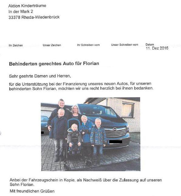 Florian lebt zusammen mit seinen Eltern und seinen drei großen Brüdern. Leider sind auch hier nicht alle gesund. Der 9-jährige Maximilian leidet an LRS (Lese- und Rechtsschreibschwäche). Der Vater ist der Alleinverdiener der Familie und die Mutter kümmert sich um die Kinder. Weil das Auto der Familie nicht mehr verkehrstüchtig ist, hat die Mutter Kontakt aufgenommen. Sie ist dringend auf ein Großraumfahrzeug angewiesen, um die verschiedenen Therapien (wie Reittherapie, Physiotherapie, Logopädie), Musikschule etc. wahrnehmen zu können. Weil Ihnen die Anschaffung eines geeigneten Fahrzeugs aus eigener Kraft nicht möglich ist, hat sie um Unterstützung gebeten.